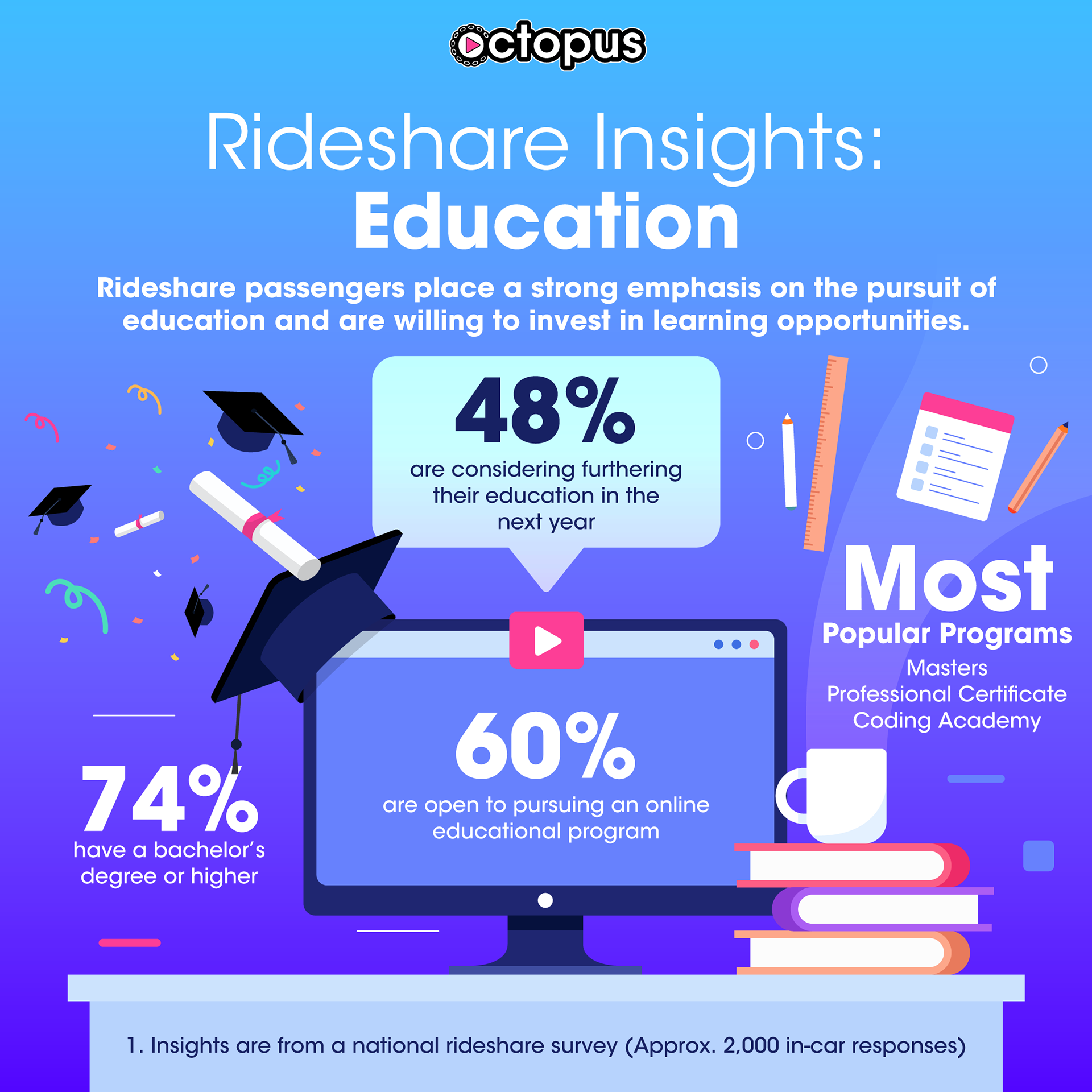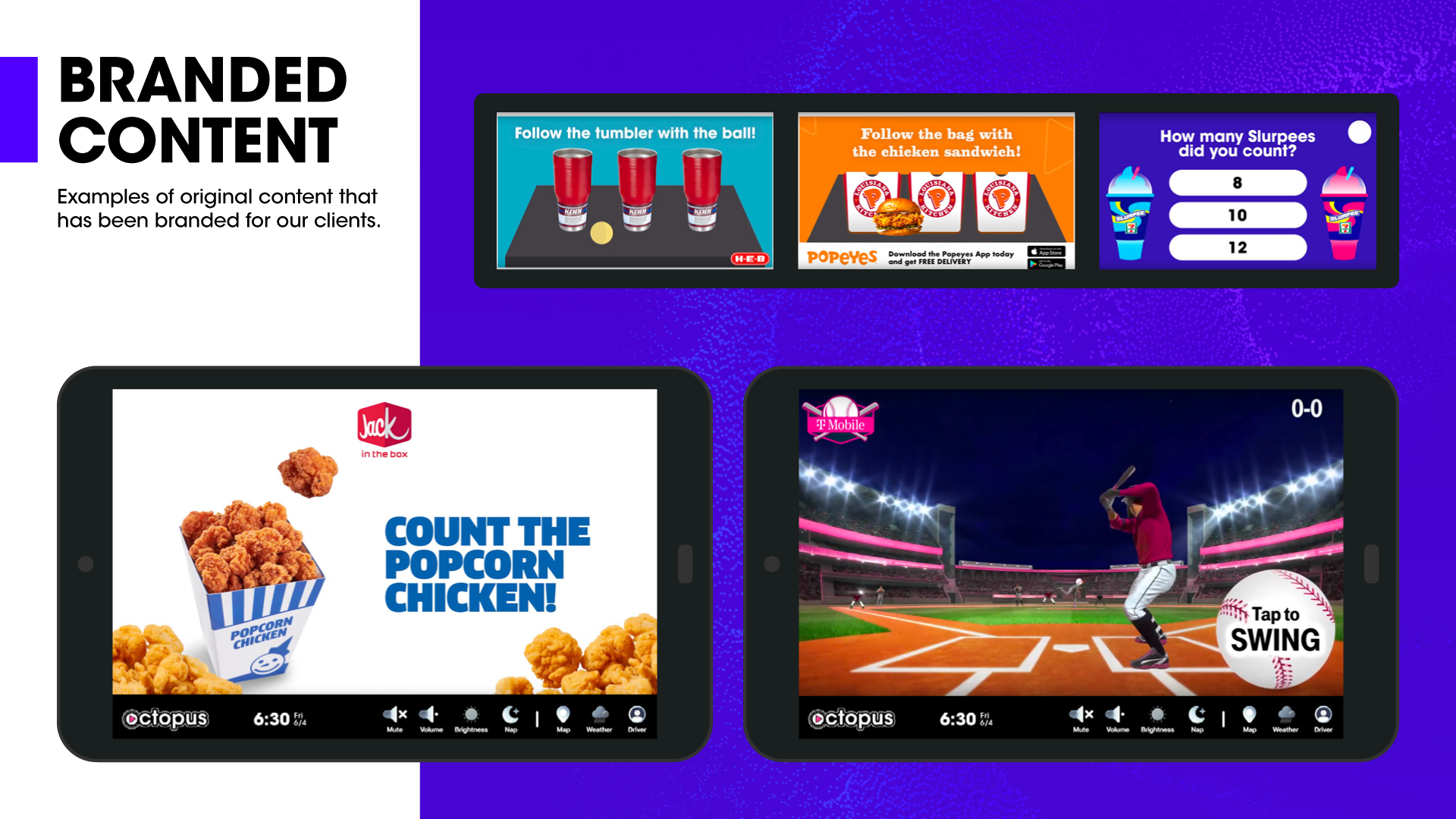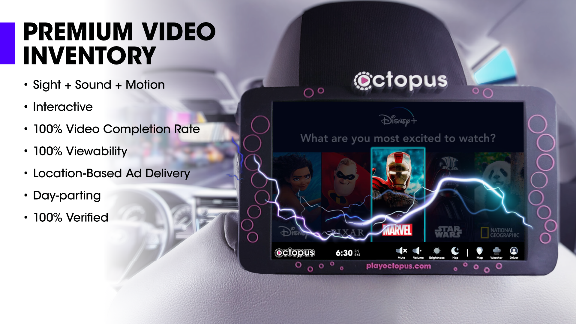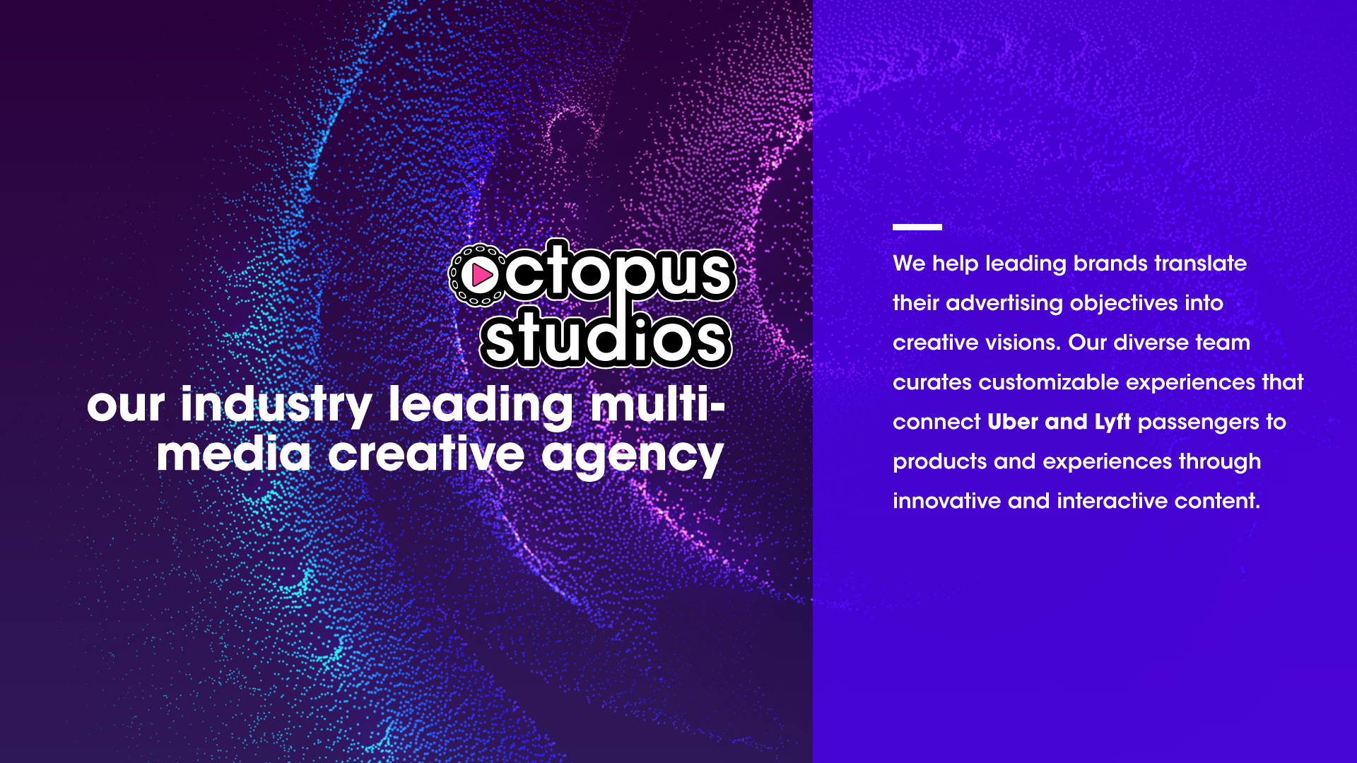 Octopus Interactive needed an in-house creative leader to help build and scale a new category of digital-out-of-home advertising as a high-growth startup. The ask was to define brand and marketing strategy, support sales and advertiser partnerships, and create engaging, validated creative experiences for a location-based rideshare ad platform - while proving audience engagement to partners, advertisers, and investors.